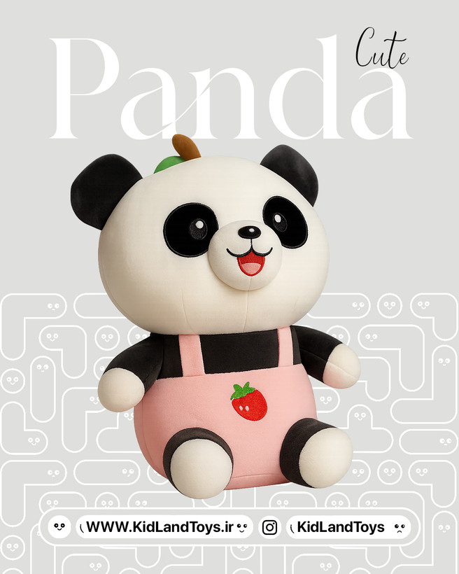 ترکیب رنگ سفید و مشکی کلاسیک پاندا با لباس صورتی و نشان توتفرنگی، جلوهای فانتزی و کودکانه به این عروسک بخشیده است. این طراحی باعث میشود کودک بهراحتی با آن ارتباط برقرار کند و حس شادی و امنیت را تجربه کند.